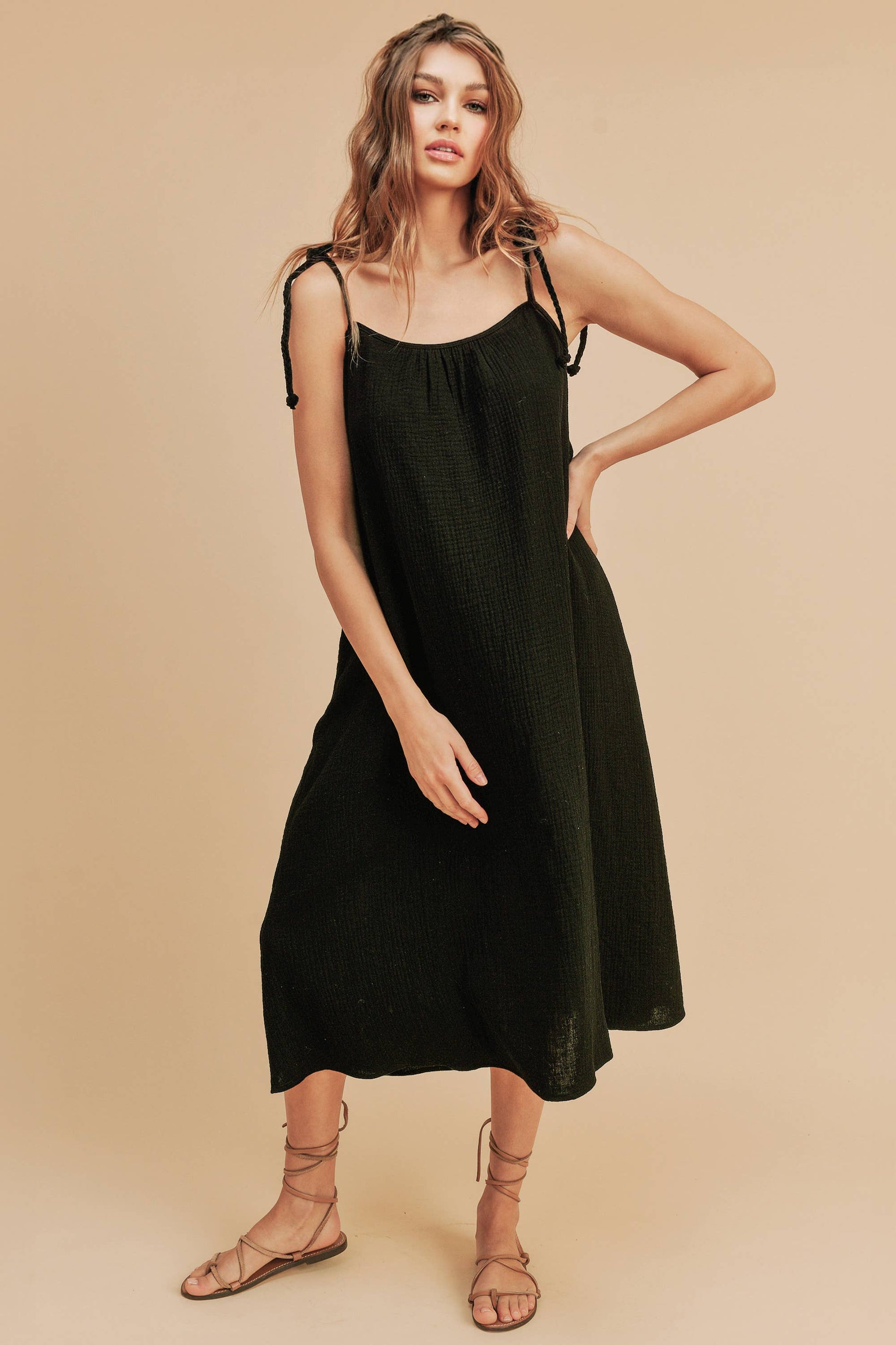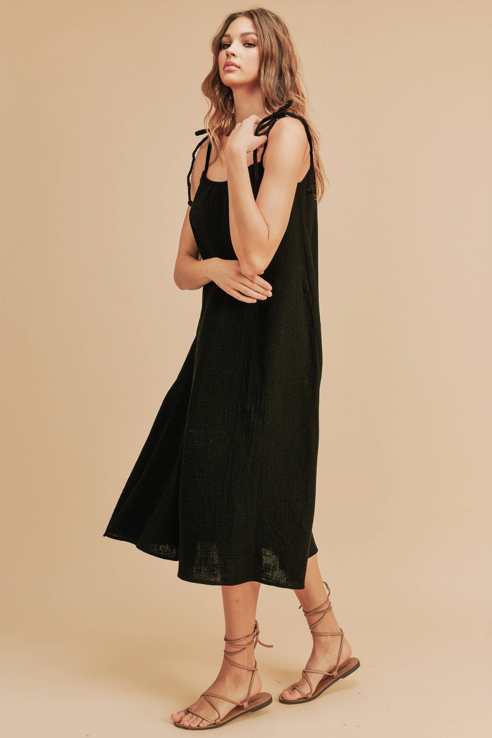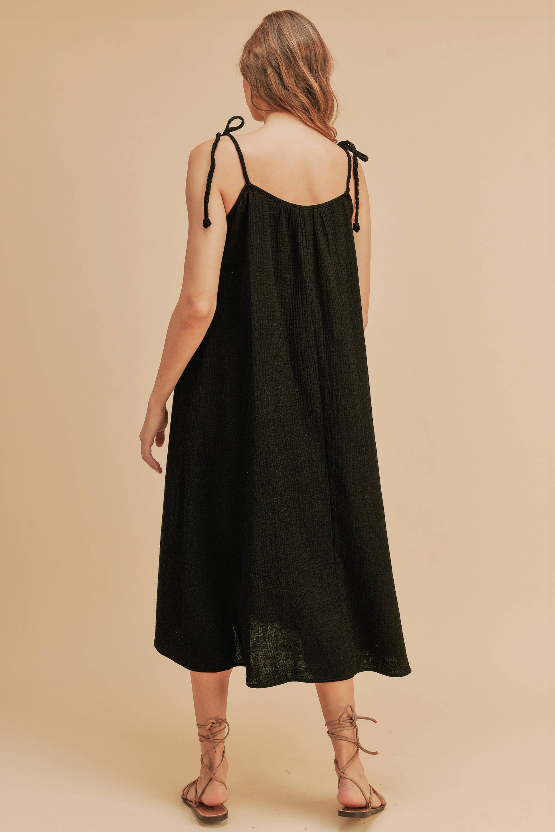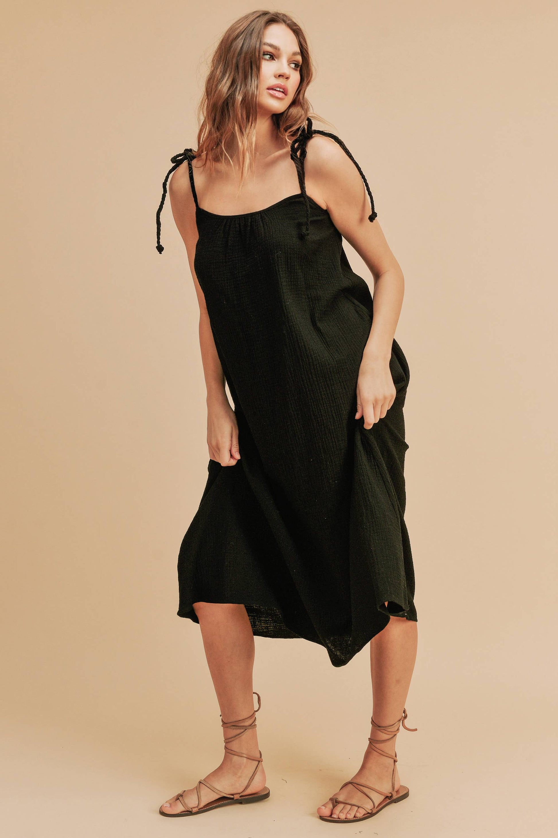 Sultry and stunning for any occasion, this sweet Pyper midi features a braided tie at the shoulder, pockets and made with the softest cotton gauze fabric.