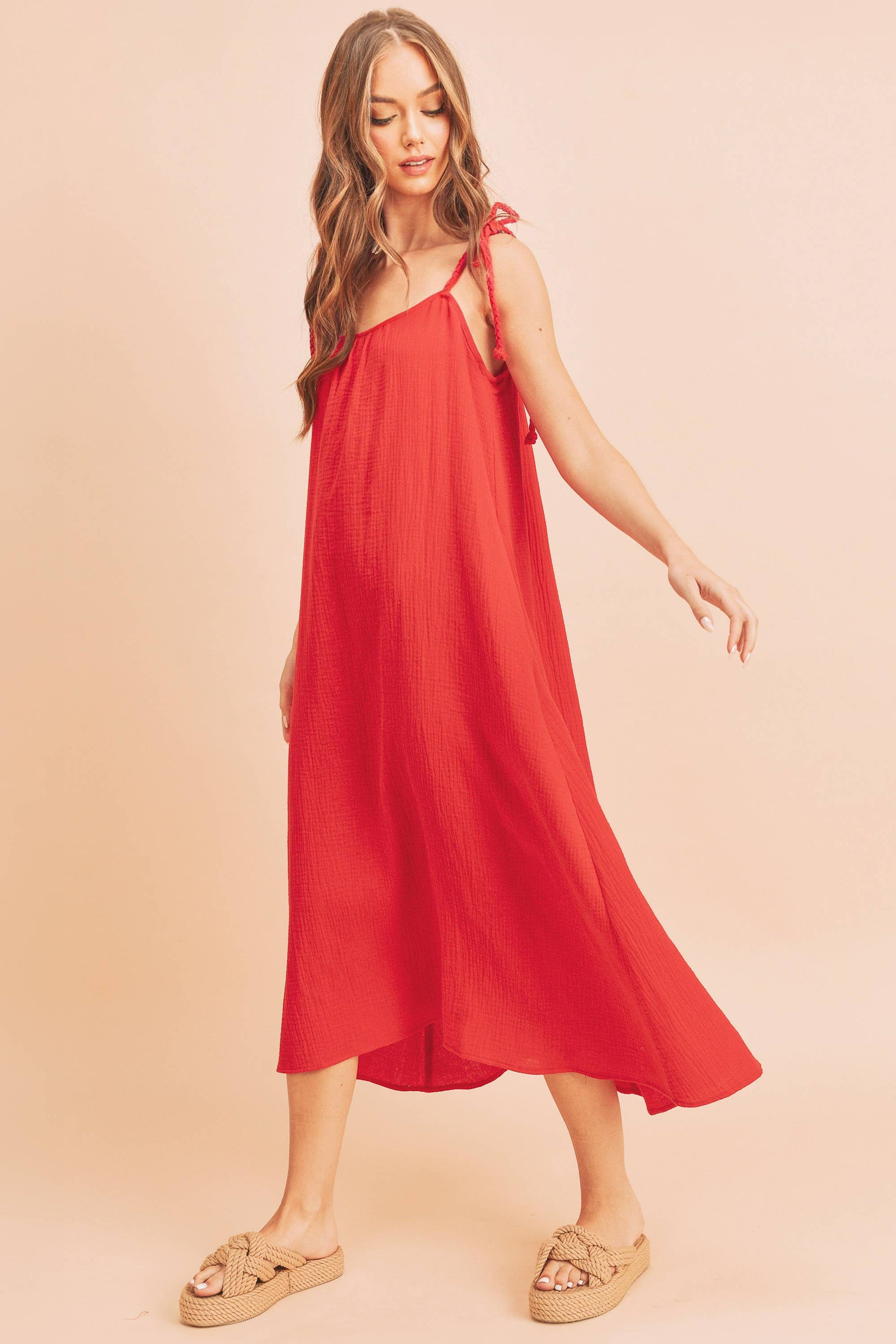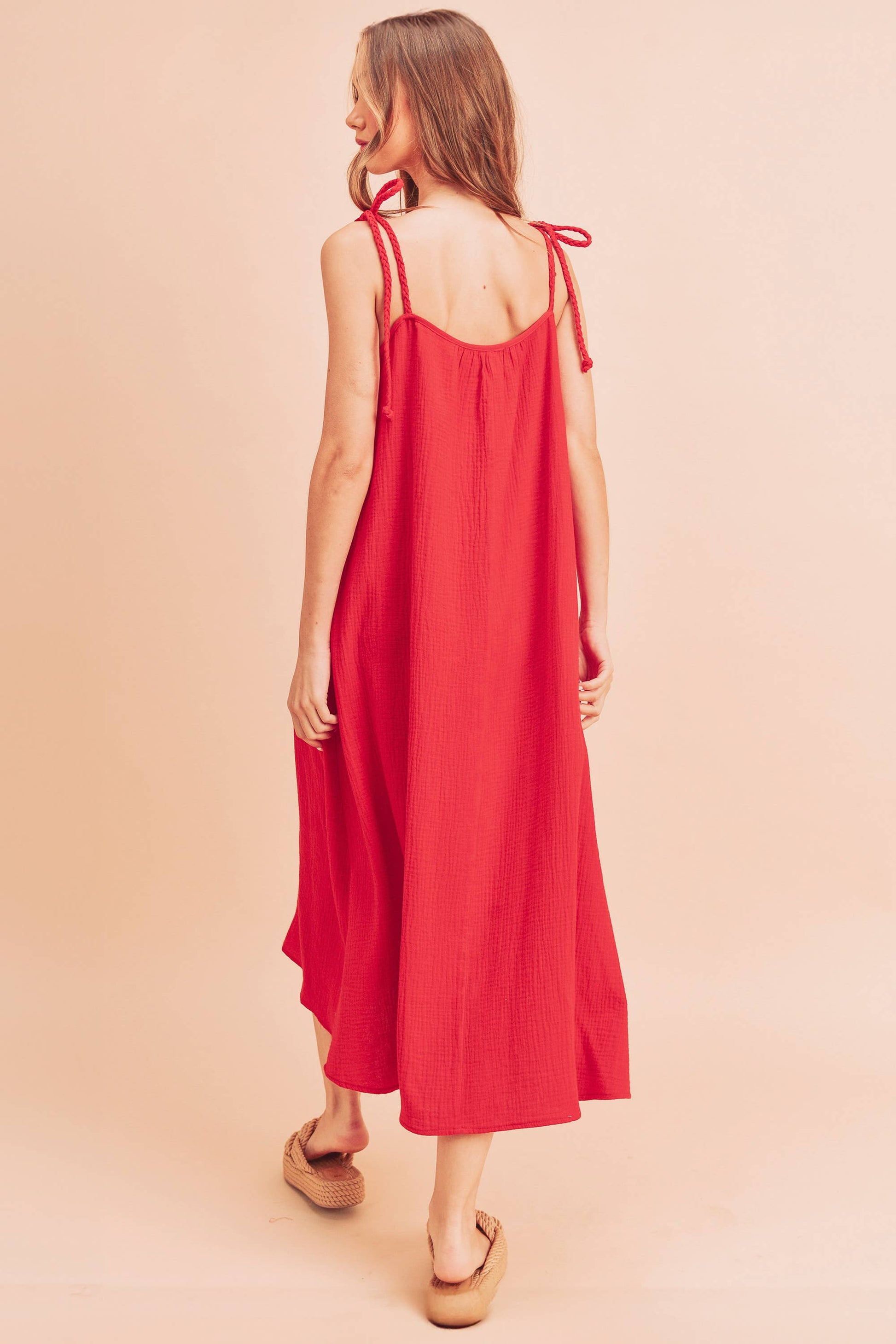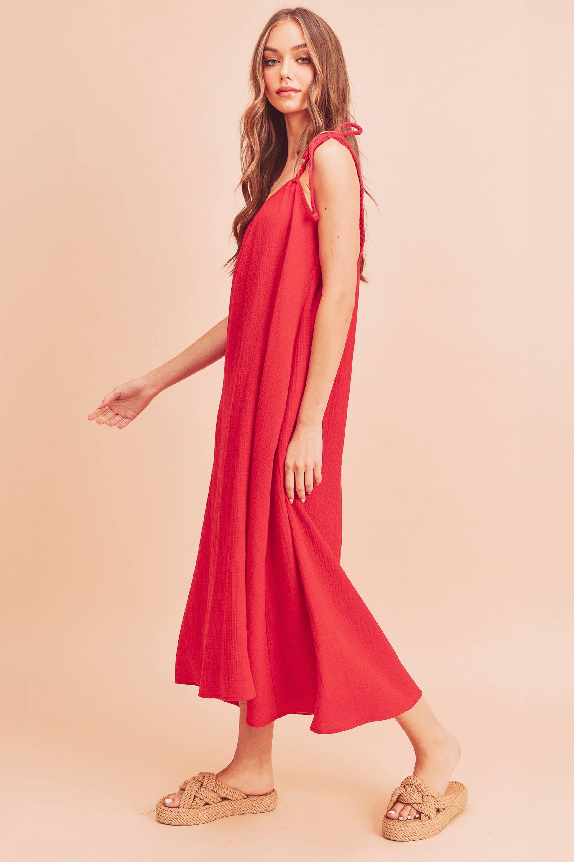 Sultry and stunning for any occasion, this sweet Pyper midi features a braided tie at the shoulder, pockets and made with the softest cotton gauze fabric.