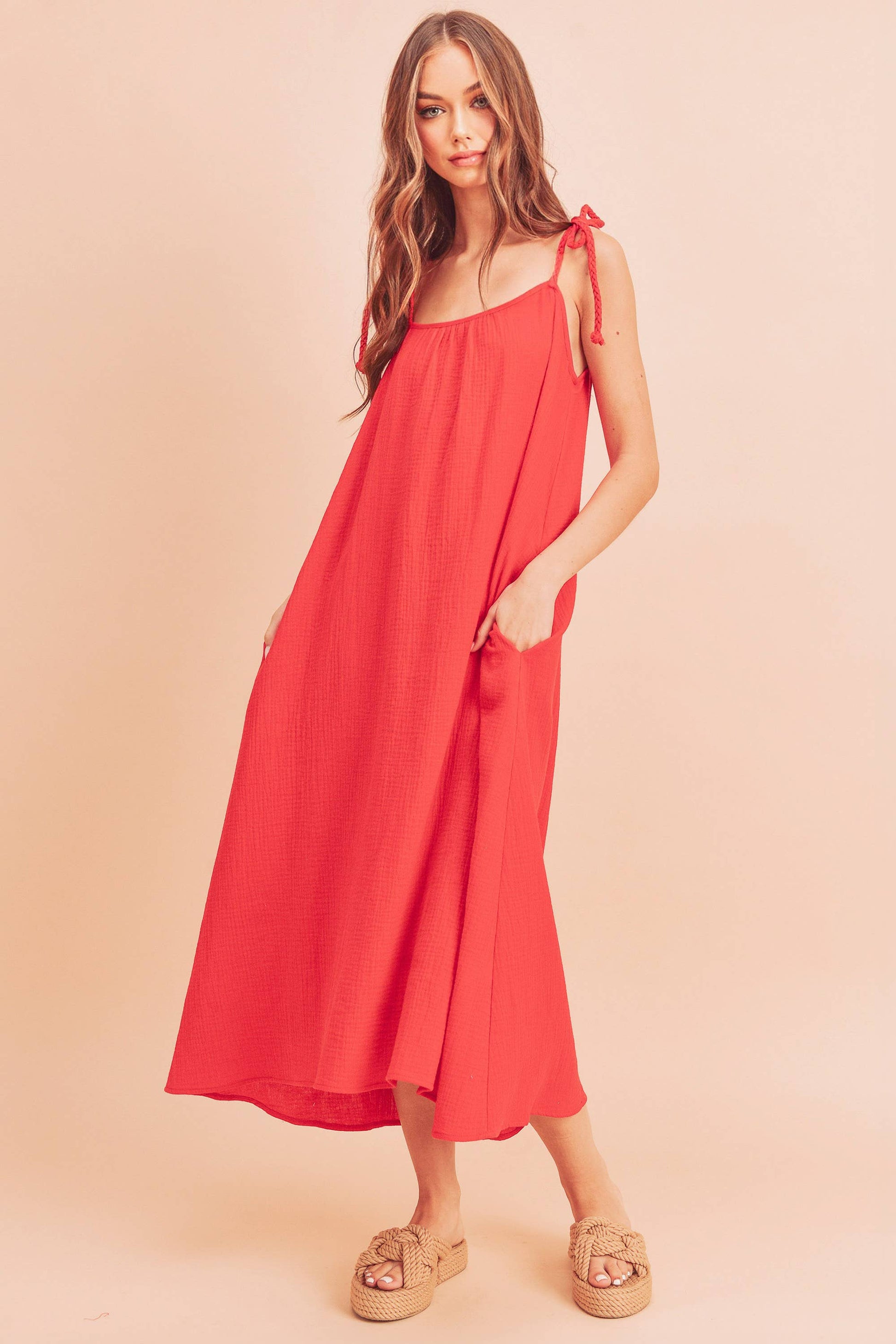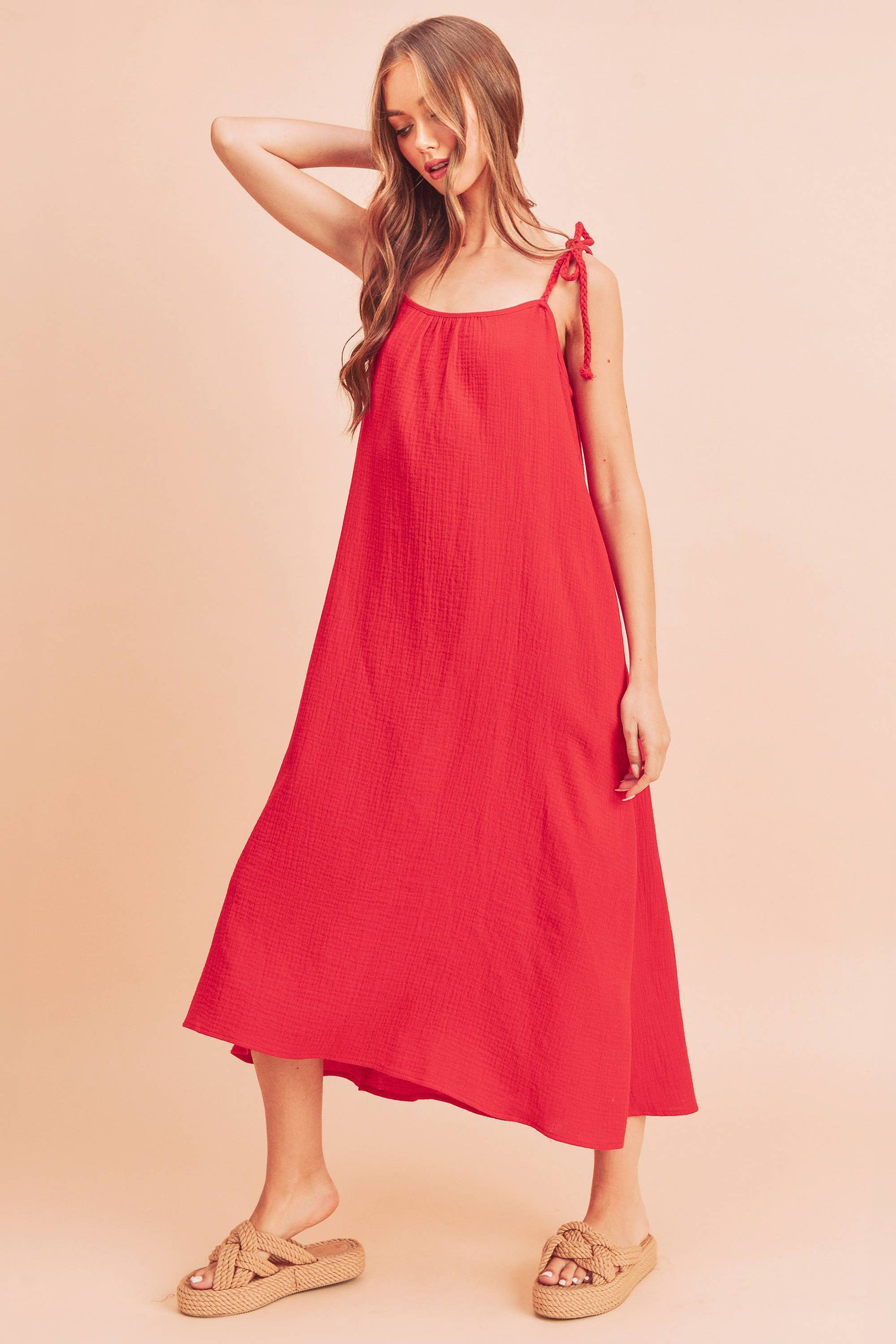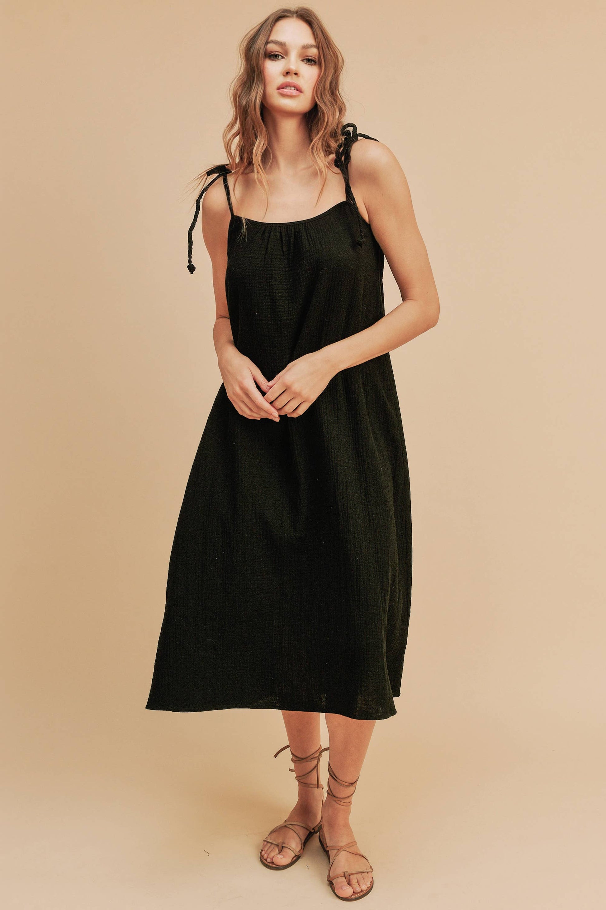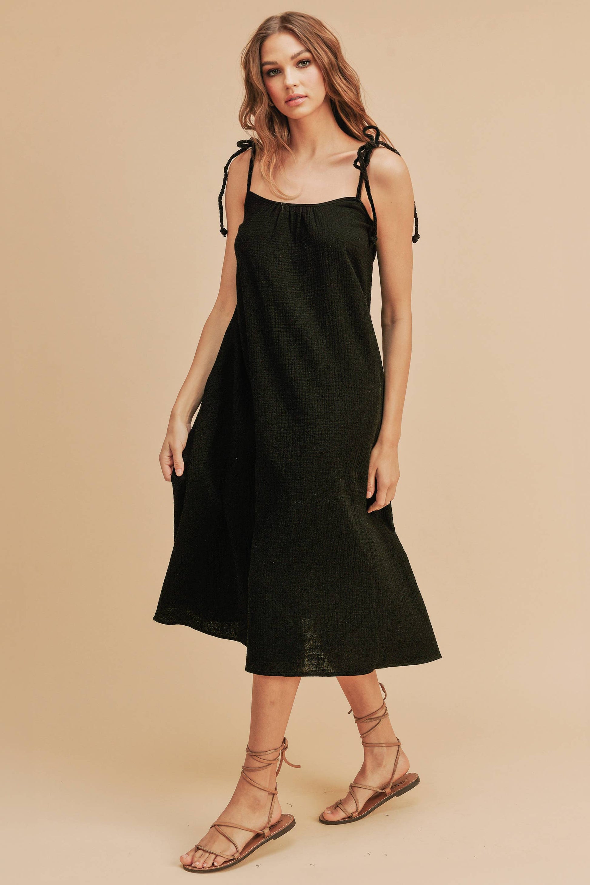 Sultry and stunning for any occasion, this sweet Pyper midi features a braided tie at the shoulder, pockets and made with the softest cotton gauze fabric.