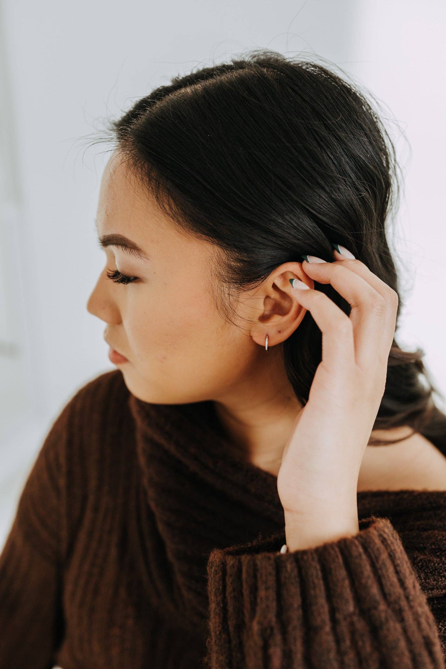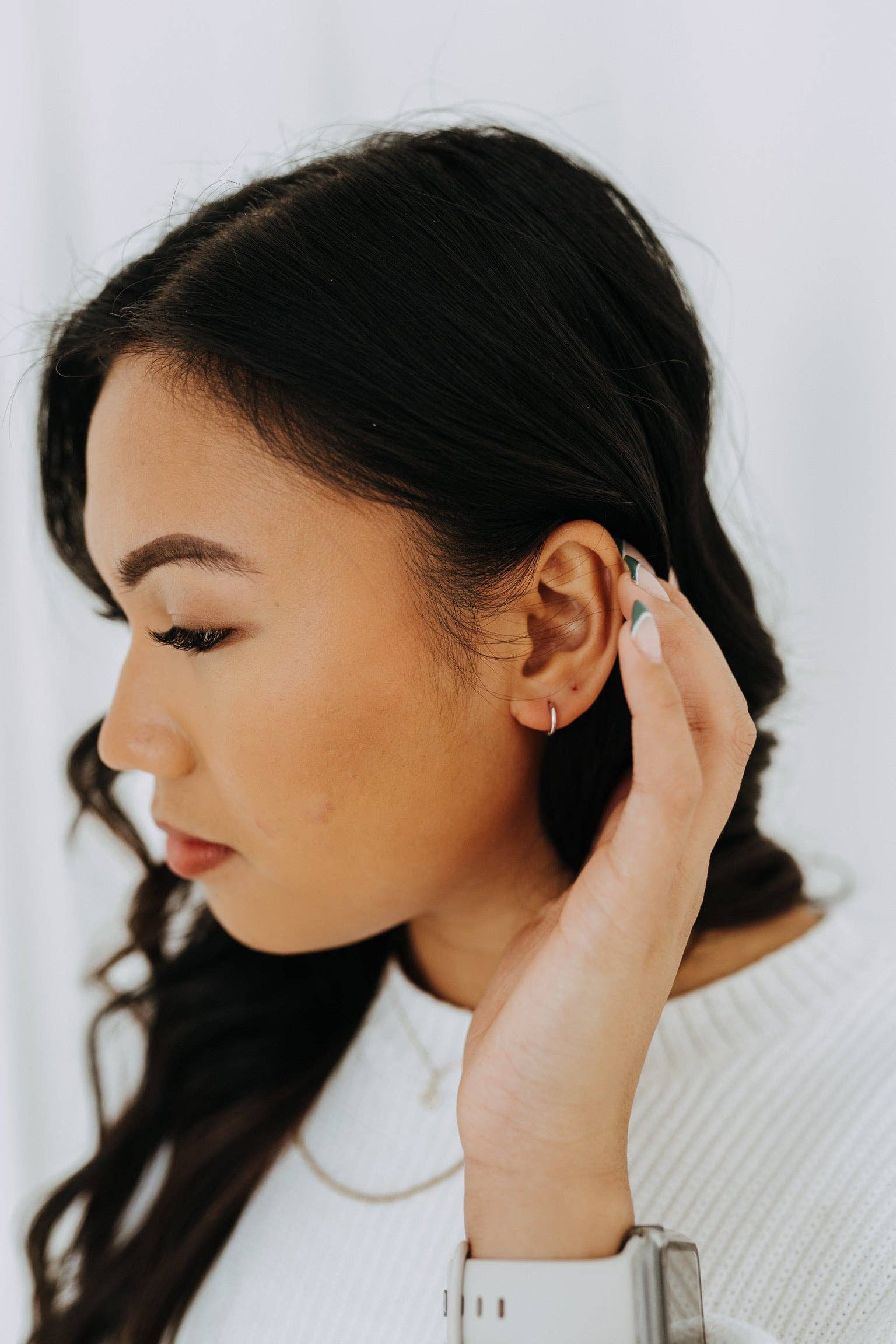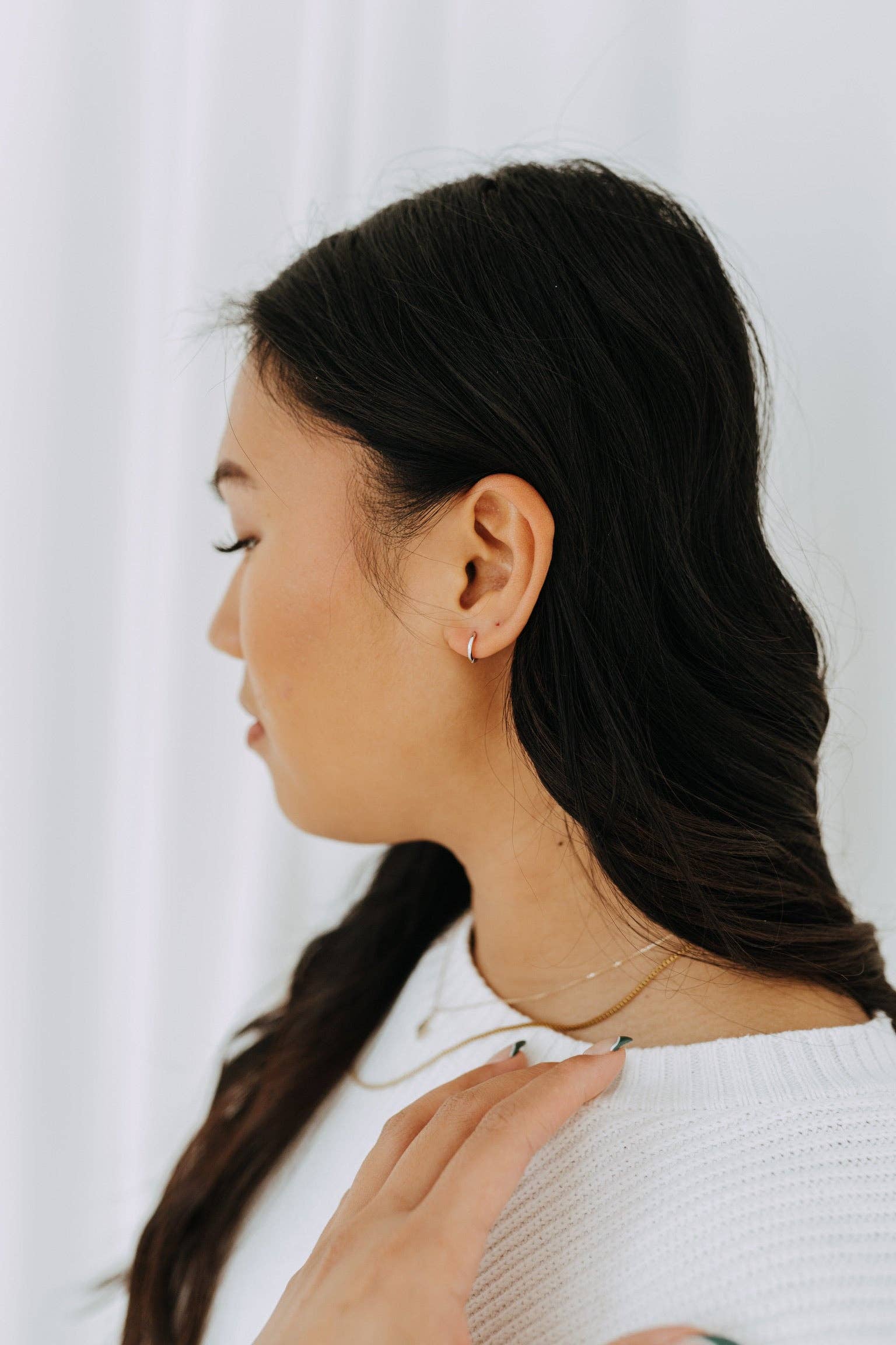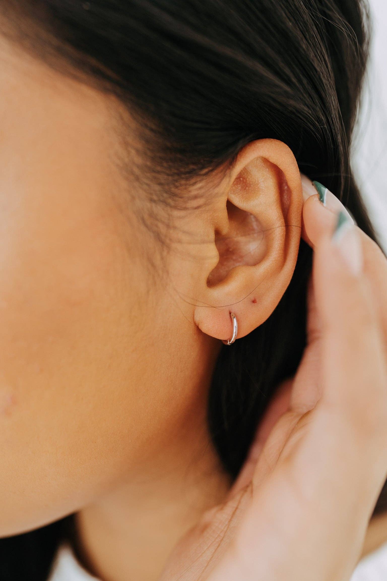 - Design: Simple, round huggie hoop design that hugs the earlobe