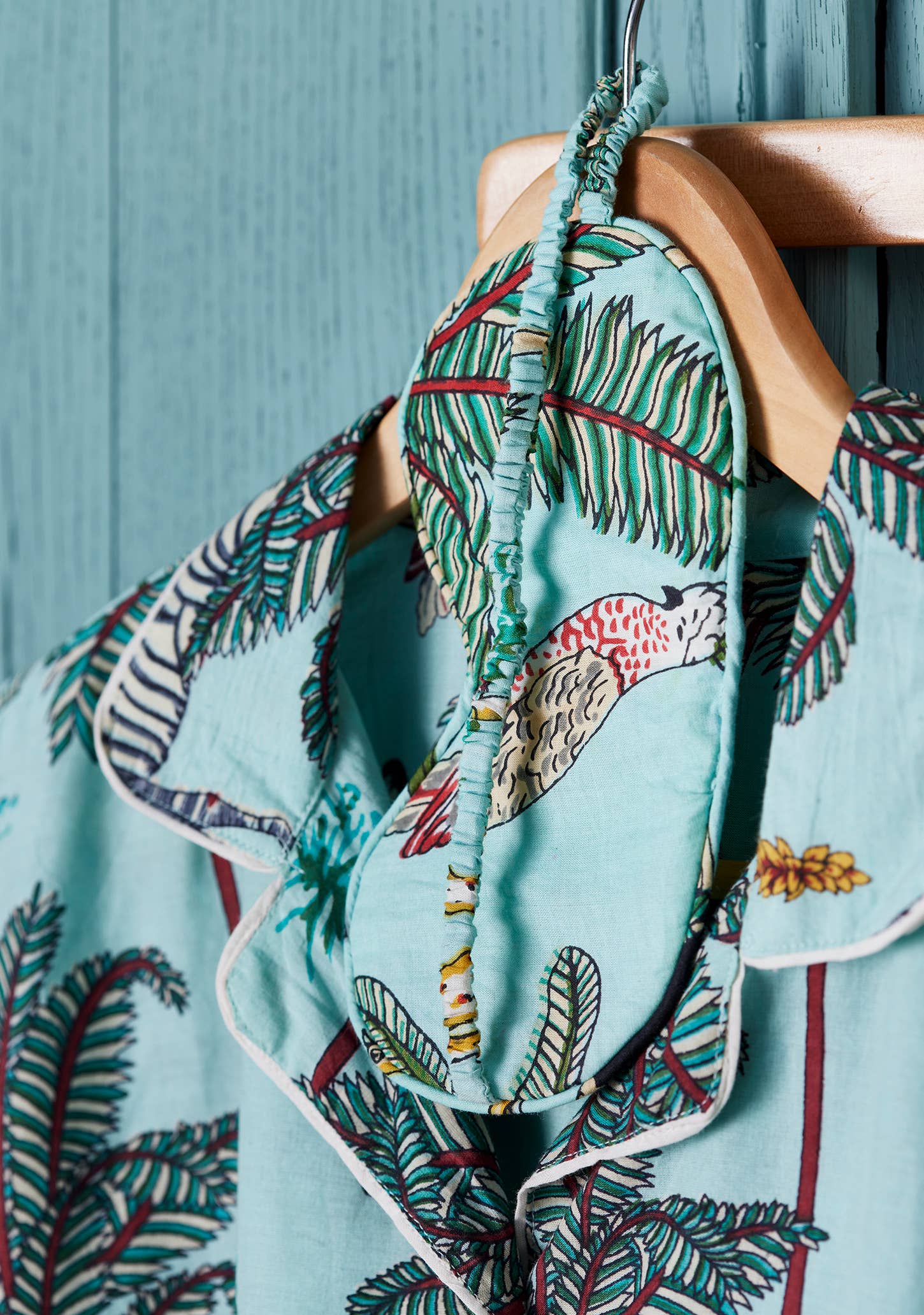 Jade jungle print pyjamas in a hand printed cotton wonderland of plantlife, exotic birds and big cats. Complemented by subtle white detailing on the collar, button through front opening, cuffs and single breast pocket. The bottoms have an elasticated waist with a pocket on each side and a decorative centre cord. Finished with matching white detailing on each leg cuff. Each pair of pyjamas comes presented in a matching drawstring bag. Part of a range of sustainable, eco friendly fashion wear with matching items available.