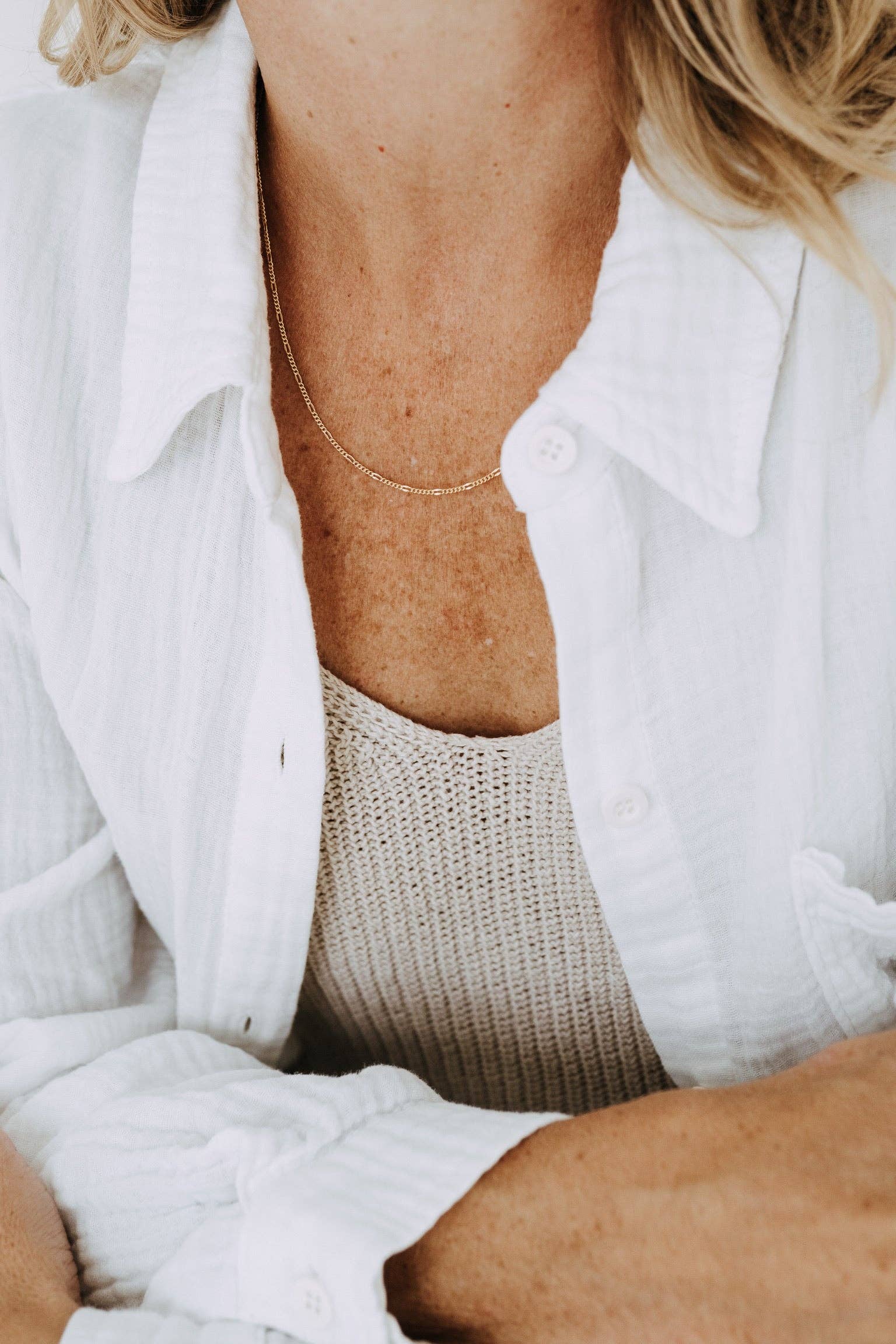 A delicate classic you’ll never want to take off. The Lace Chain Necklace features fine, textured links that catch the light with every movement—like lace for your neckline. Lightweight, shiny, and effortlessly elegant, it’s the perfect everyday piece whether worn solo or as a base for layering.