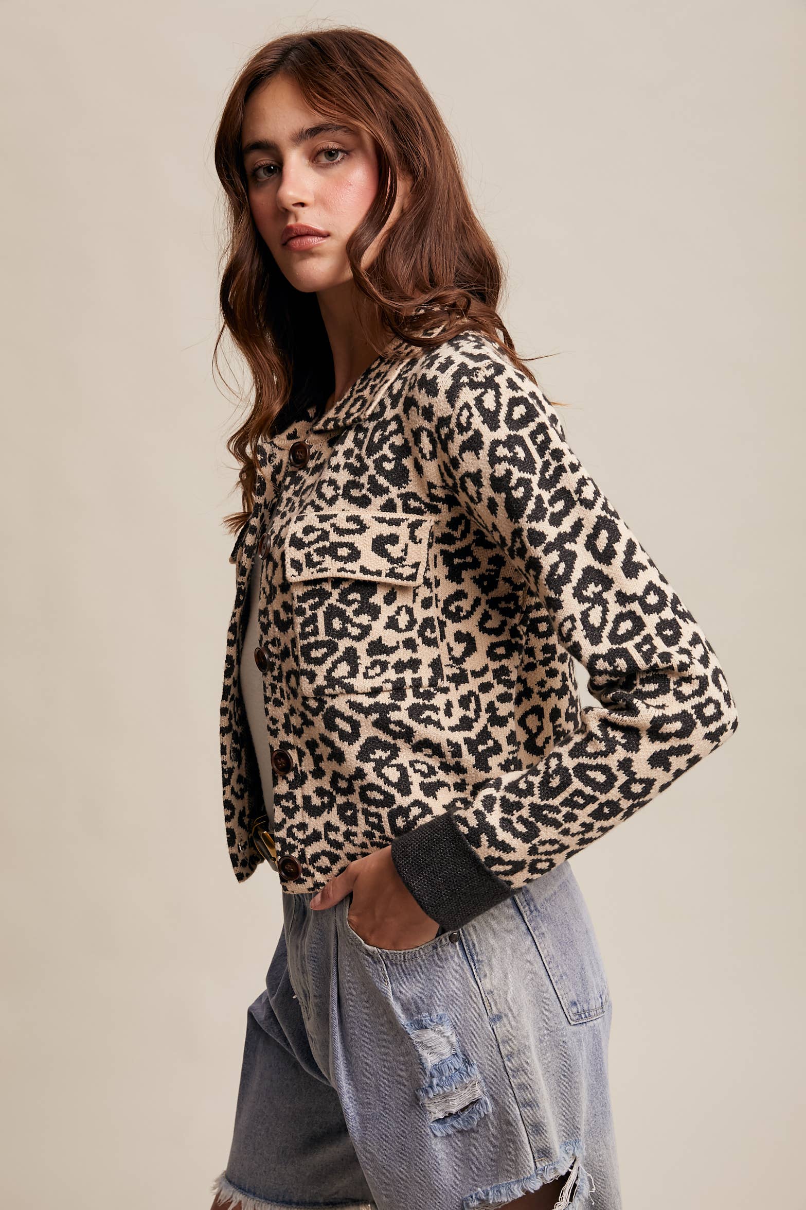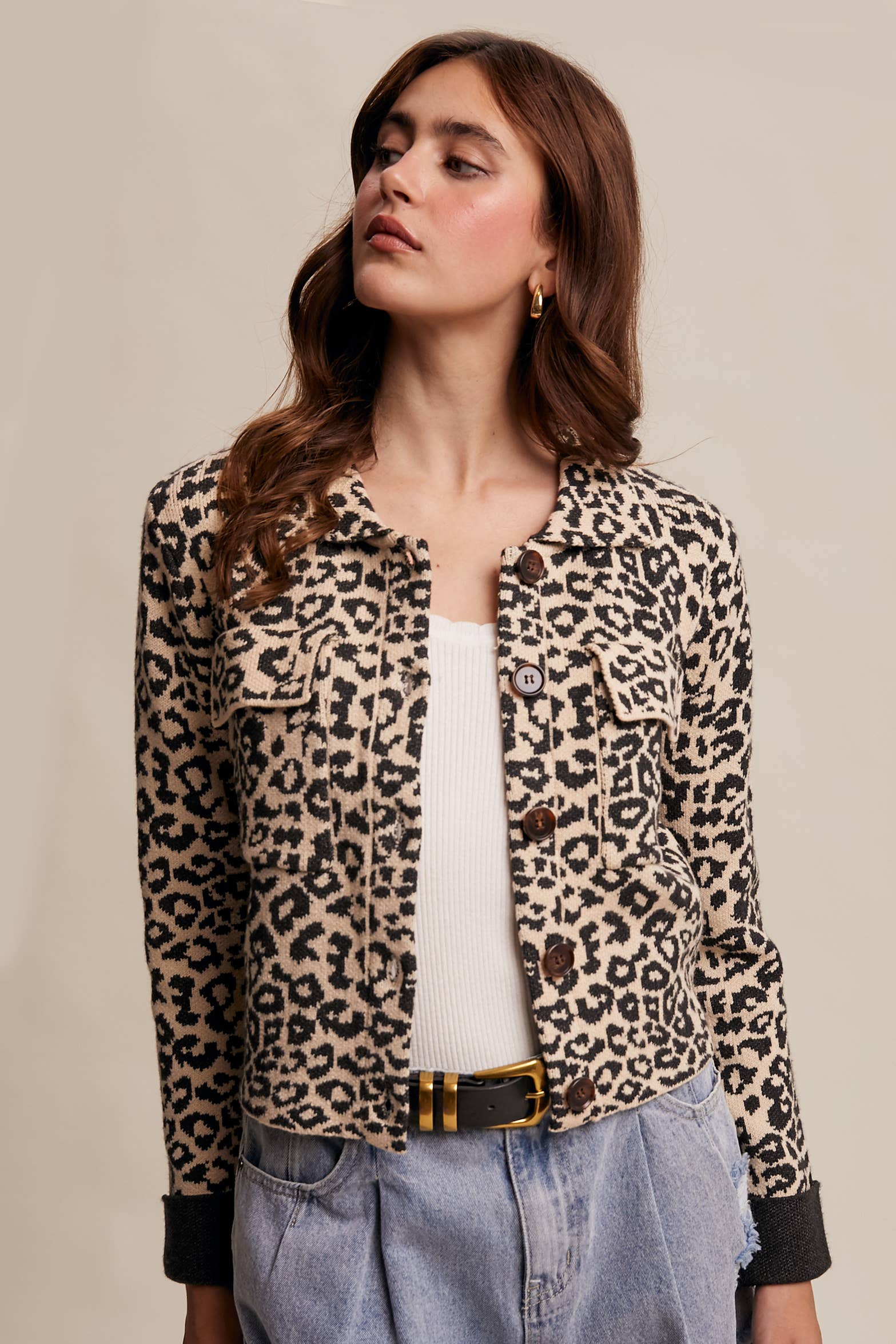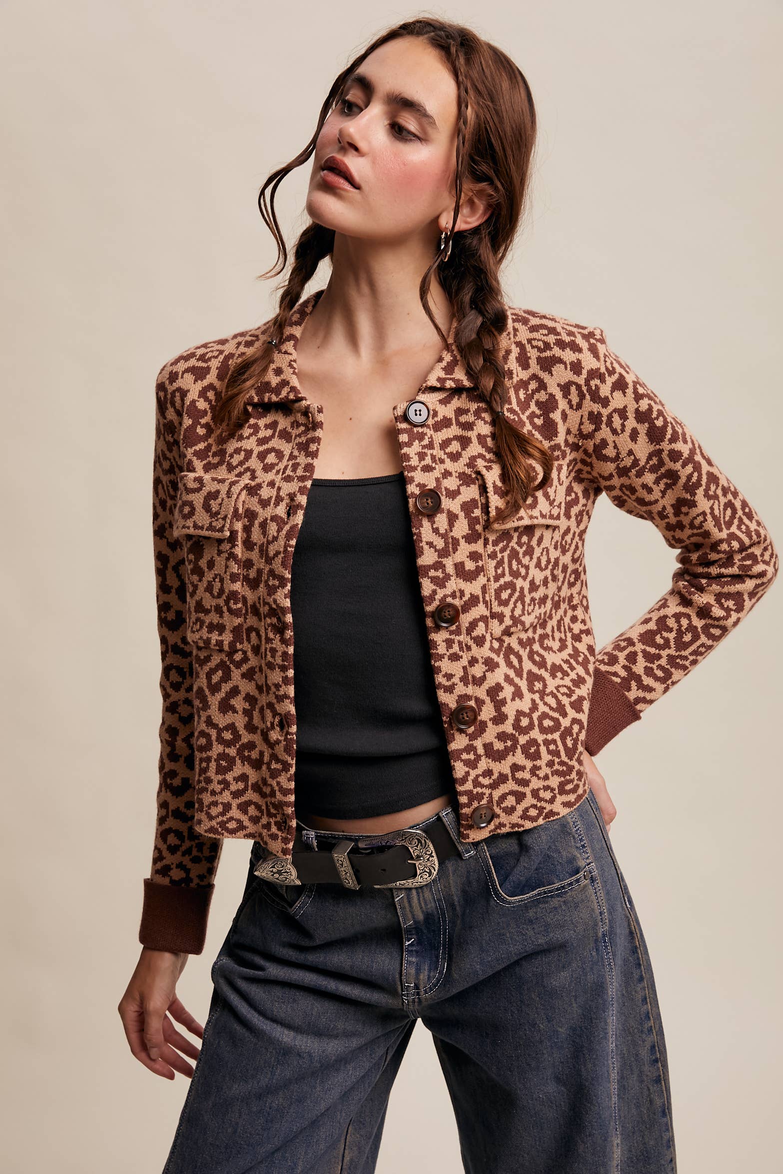 Cozy medium-weight knit with a bold leopard jacquard pattern Front button-up with chunky tortoise-style buttons. Functional flap chest pockets with button details. Full-length sleeves with contrast knit cuffs for structure and comfort. Classic shirt collar for a polished touch. A standout layering piece that combines cozy texture with fierce animal print-perfect for casual streetwear with a bold twist.