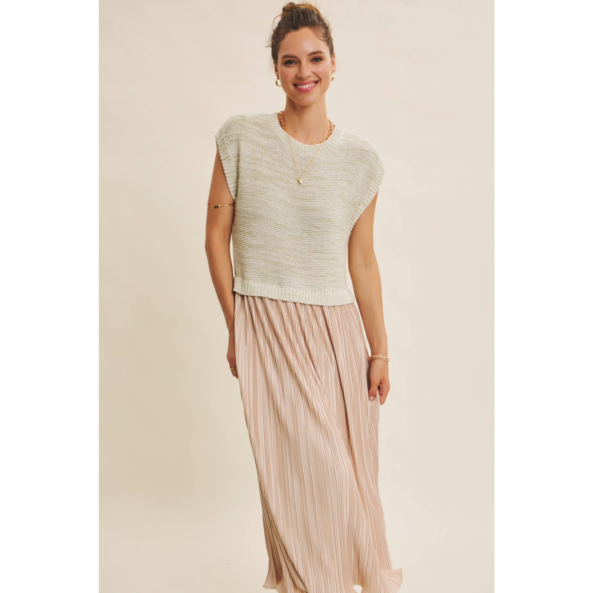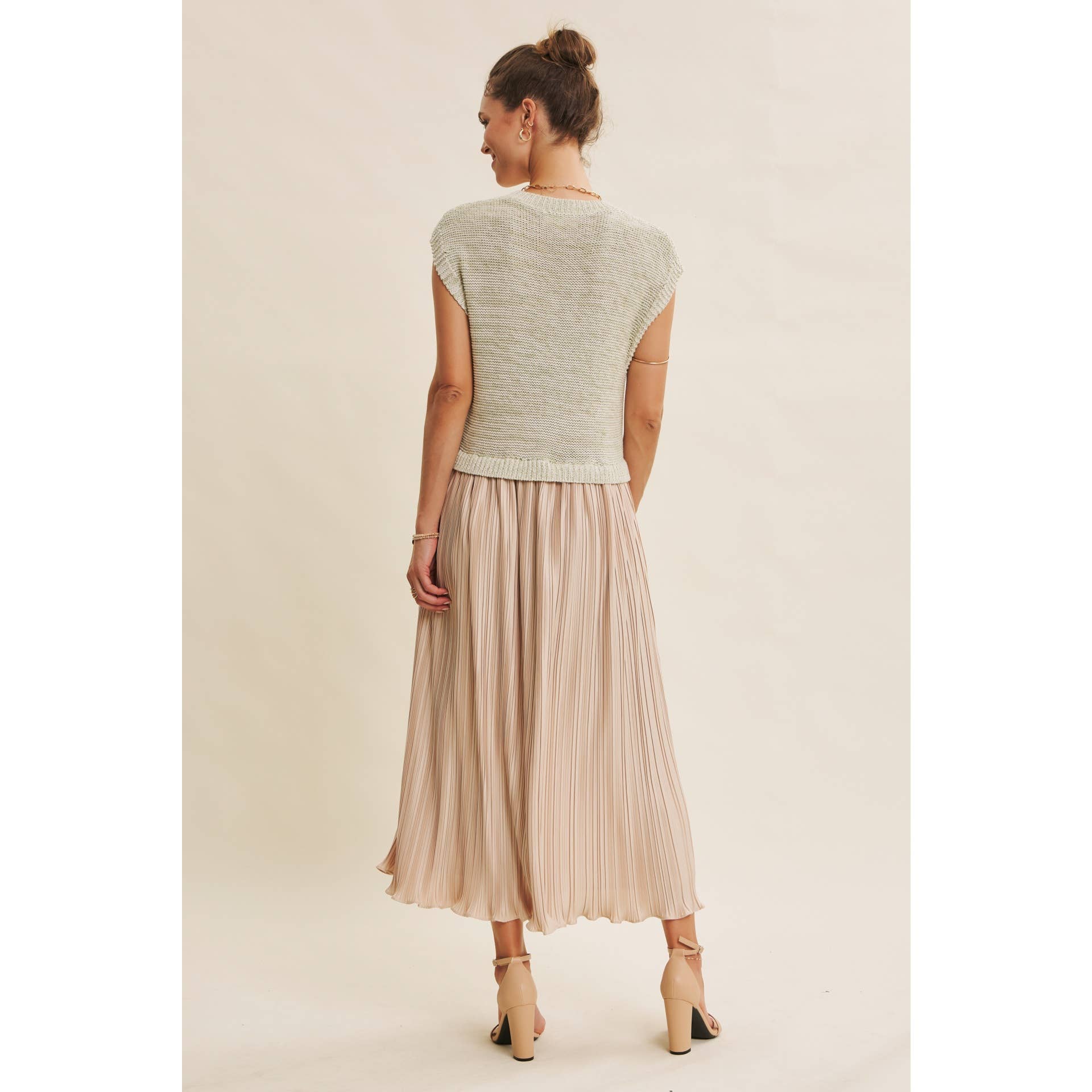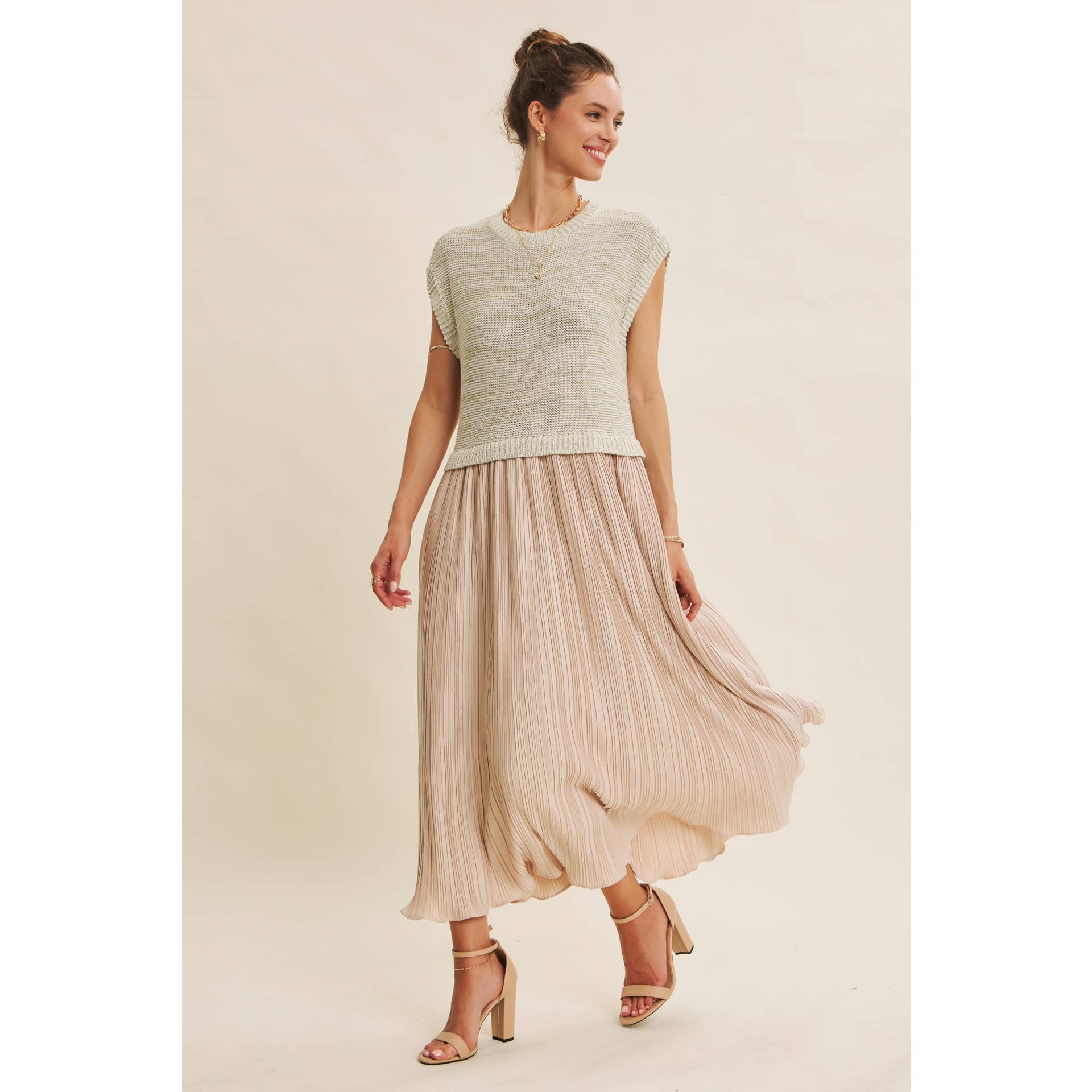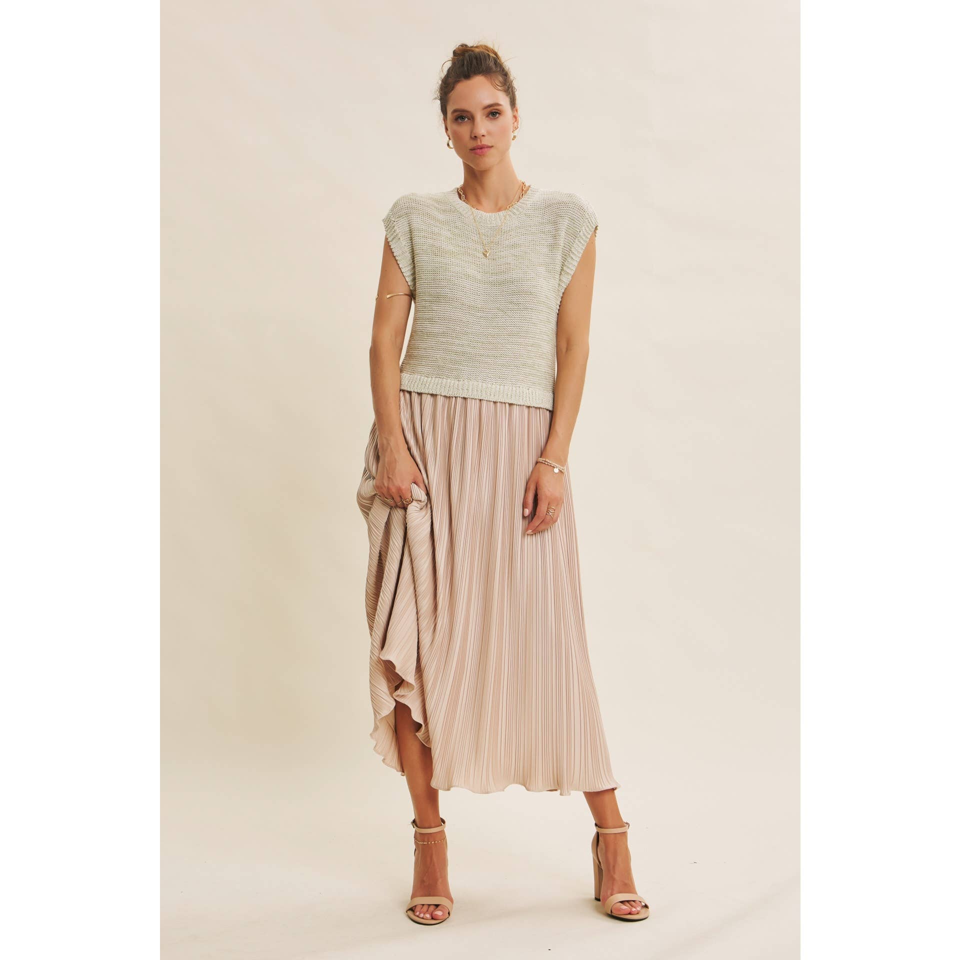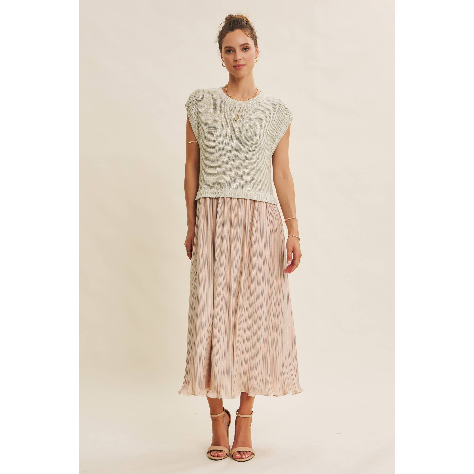 This twofer midi dress blends cozy textures and graceful movement in one effortless piece. The top is crafted from a metallic-accented sweater knit, giving subtle shimmer without going over the top—perfect for holiday lunches or work events. The pleated skirt flows with every step, bringing a sense of ease and elegance. Whether worn to a casual office day or a weekend brunch, this piece makes an understated yet memorable impression.