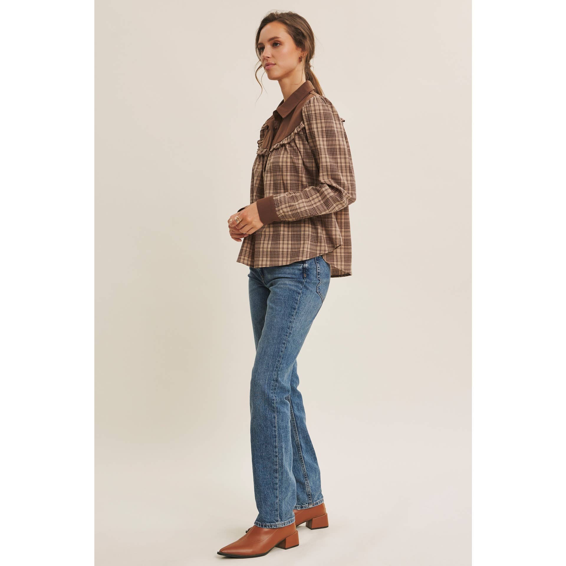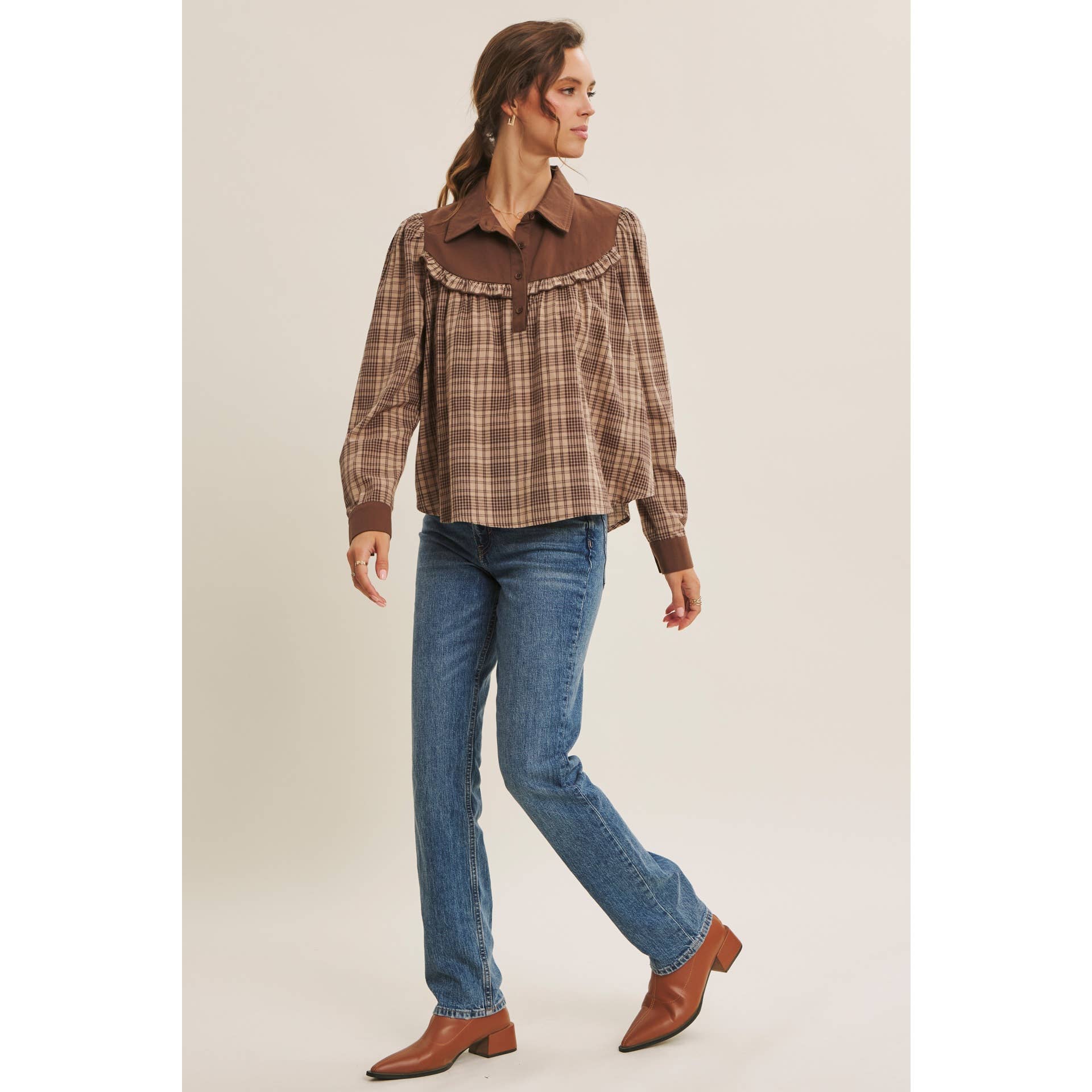 A perfect blend of casual comfort and classic charm, this garment-washed henley top combines soft plaid cotton with a solid contrast yoke for a timeless, lived-in feel. The relaxed flare silhouette is finished with delicate mini ruffles along the chest, adding just the right touch of femininity. Featuring a collared neckline, long sleeves with button cuffs, and a rounded hem, it’s an easy piece to style with jeans, cords, or skirts for year-round wear. 100% Cotton