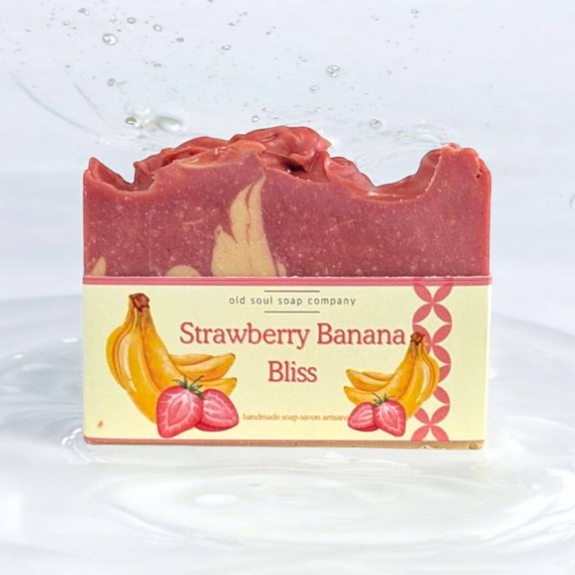 Strawberry Banana Bliss: Indulge in a fruity shower experience with our Strawberry Banana Bliss Soap. Ingredients: Cocos Nucifera (Coconut) oil, Helianthus Annuus (Sunflower) Seed Oil, Canola Oil, Aqua, Olea Europaea (Olive) oil, Sodium Hydroxide, Fragrance Oils.